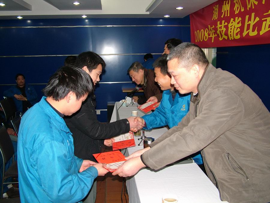 我公司自2007年開展各個(gè)工種技術(shù)比武后,08年又有新的擴(kuò)展,參加工種擴(kuò)大到七大工種:車工、鉆工、鏜工、行車工、電焊工、電工(AB類)、裝配鉗工(AB類),總參賽人數(shù)達(dá)183人。經(jīng)5月、10月和年度的綜合排名,共有46人獲獎(jiǎng),從獲獎(jiǎng)的人員分布來看,中年員工占1/3,青年員工2/3,這說明青年員工已在不同崗位上挑起了擔(dān)子。圖為公司領(lǐng)導(dǎo)向“技術(shù)帶頭人”、“技術(shù)能手”和“操作能手”頒獎(jiǎng)。